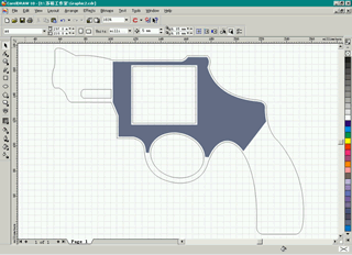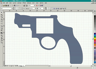然后依次使用同樣的方法,使另外兩個圖形在手槍外輪廓中形成鏤空狀態。操作完成后的圖形看上去似乎并沒有什么改變,這是因為圖形沒有被填充,仍然以線條顯示的結果。將其選中,然后在色盤上點擊選擇一種顏色給圖形填充,最終效果(如圖9)。