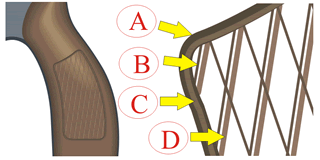手柄上的木刻效果和槍身上凹凸的菱形效果,是深色和淺色線條疊加后在視覺上產生的一種錯覺,顏色的明暗變化起到了決定性的作用??匆幌路糯蟮男Ч憔蜁f:哎,原來如此?。。ㄈ鐖D26-27)(圖26:a線填色c35、m45、y60、k60,線寬1.0mm;b線c35、m45、y60、k45,線寬0.2mm;c線c35、m45、y60、k30,線寬0.4mm;d線c35、m45、y60、k10;圖27:a線填色c17、m0、y0、k70,線寬0.2mm;b線填色c15、m0、y0、k45,線寬0.2mm)