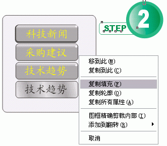 “復(fù)制填充”是將藍(lán)色按鈕的填充屬性復(fù)制到金屬按鈕上,不管對(duì)方是何填充,統(tǒng)統(tǒng)一律取而代之;