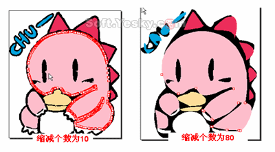 為了更詳細地說明它的特點,我們分別設定縮減節點的個數為10和80兩組,再看看最終得到的矢量圖上顯示的節點情況(圖13)。