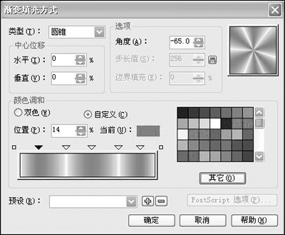 4. 選擇修剪后的對象,按住工具箱中的填充工具按鈕不放,從彈出的隱藏按鈕中選擇漸變填充工具,在類型右側的下拉列表中選擇“圓錐”,在顏色調和欄中選擇“自定義”,下面我們就要設置顏色,在漸變顏色欄中添加五個顏色點,并設置每個顏色點的填充參數為:rgb(255,255,255)、rgb(227,29,29)、rgb(255,255,255)、rgb(227,29,29)、rgb(255,255,255)、rgb(227,29,29),其它參數設置(如圖4所示)。