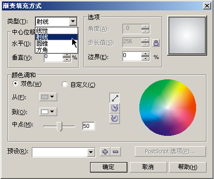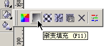 調整完成后,使用“漸變填充”(注:coreldraw10與11里此工具是“噴泉式填充”,用法是一樣的),使用“射線”方式填充,如圖