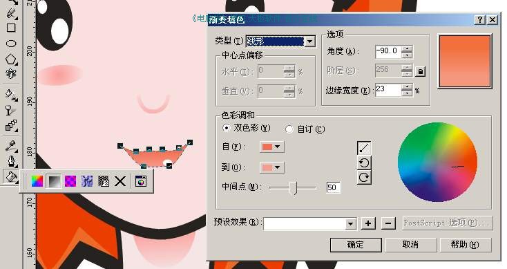 再來使用“貝茲曲線工具”繪制出嘴巴的外輪廓線,記得要使她兩邊的嘴角都往上翹一些,這樣使她微笑的樣子才可愛。然后使用左側(cè)工具欄中的“漸層填色”,使嘴巴由上到下有一個(gè)顏色深淺的漸變(圖11)。