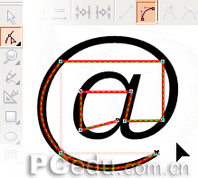 5.選擇形狀工具,在紅色輪廓上點擊一下選擇它,用形狀工具拖出一個矩形選取框選取所有所有節點。在屬性欄中,點擊convert line to curve(轉換直線為曲線)按鈕,然后拖動其中一段線條,使它盡量接近相應位置的@字符形狀。(圖05)