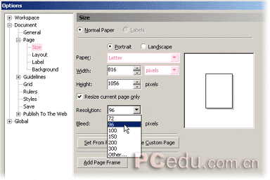 2.從layout菜單中選擇page setup(版面>頁面設置),在頁面設置對話框中,將分辨率設為96dpi(windows@)或72dpi(macintosh@)。這兩種分辨率會分別和兩種系統相匹配,這樣在網頁上可以以1∶1的正確比例觀察圖片。即使你打算為商業印刷輸出圖片,使用這兩種設置也會避免混亂。你可以在輸出文件前改變分辨率。(圖02)