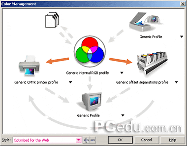 1.首先,在tools菜單下,選擇color management(工具>顏色管理器)。在樣式下拉列表中,選擇optimized for the web(優化為web)。這會將顏色工作空間設為rgb。(圖01,中文版的用戶不用理會圖中那些英文,只要選擇“優化為web”這一項就可以了。)