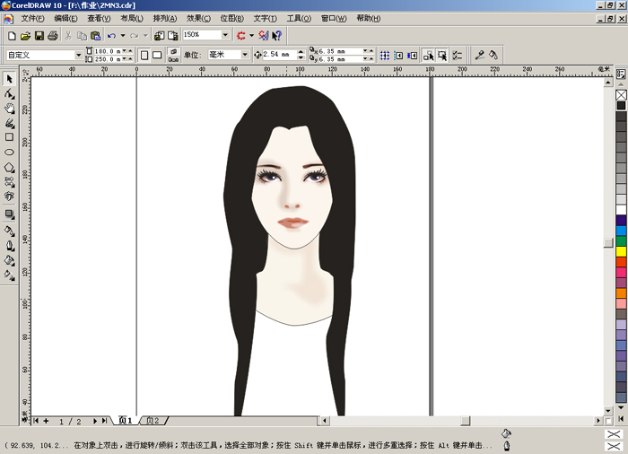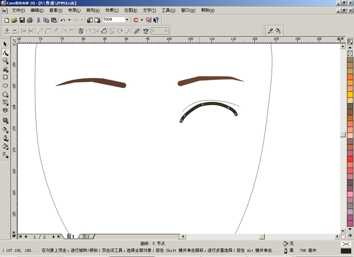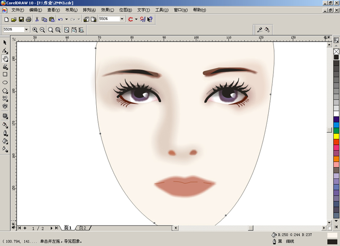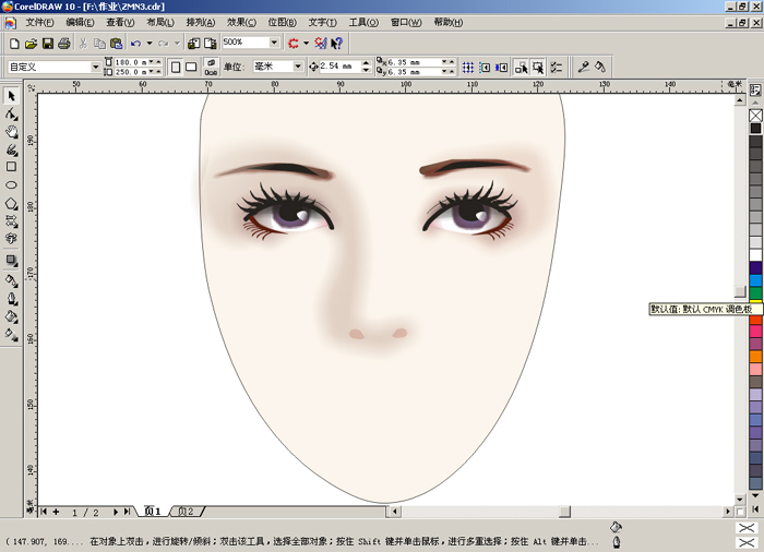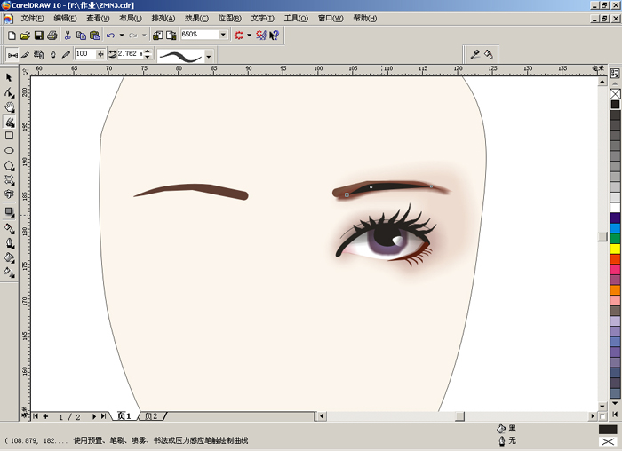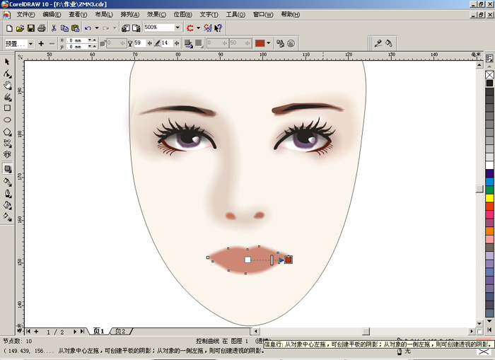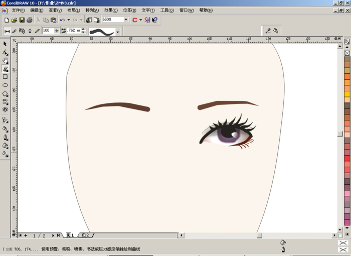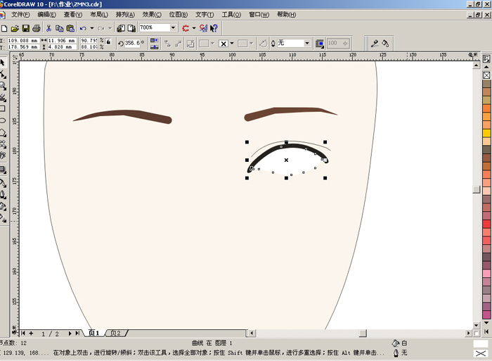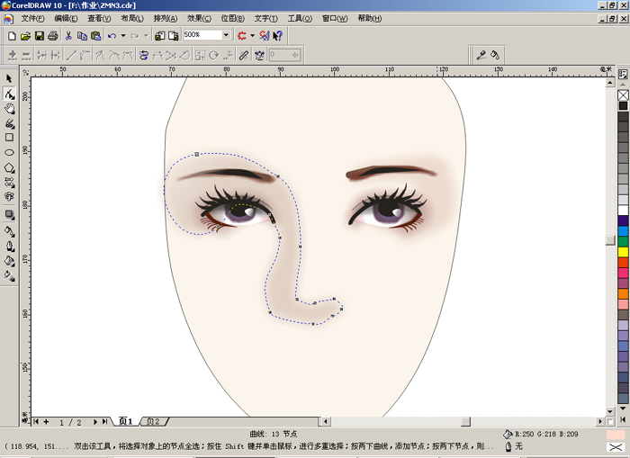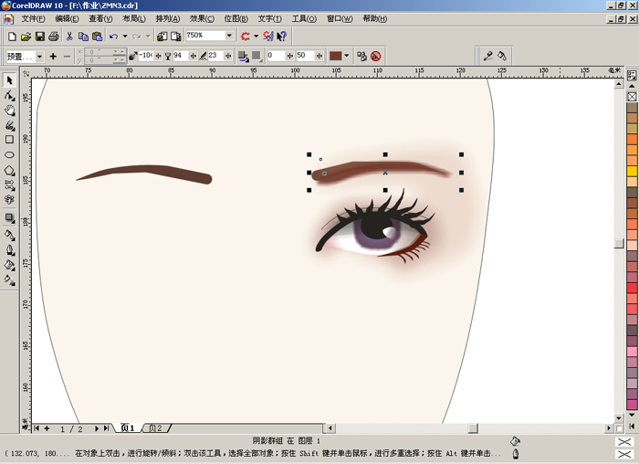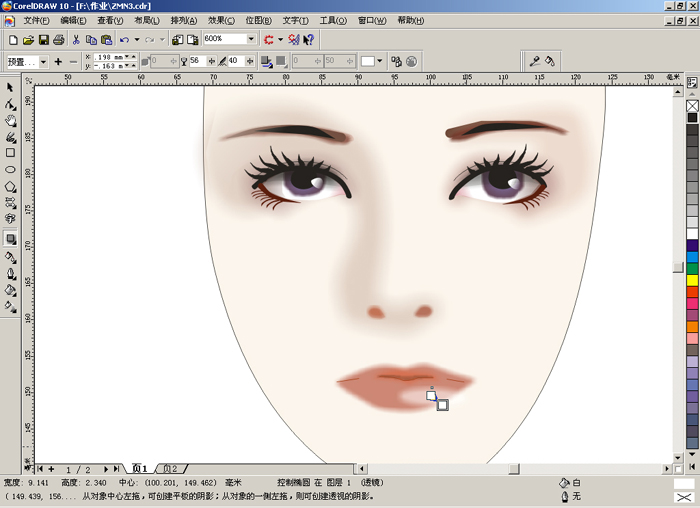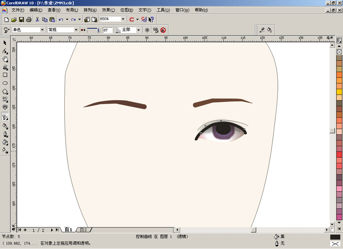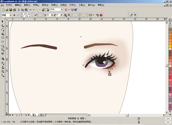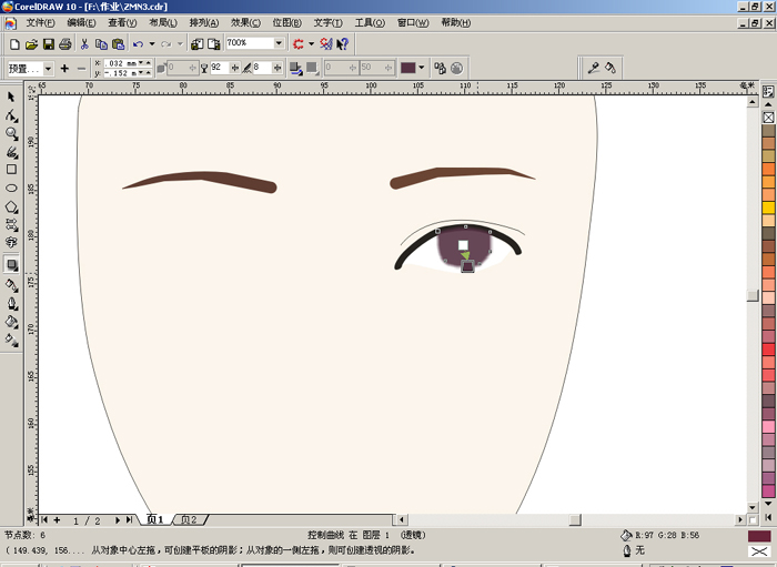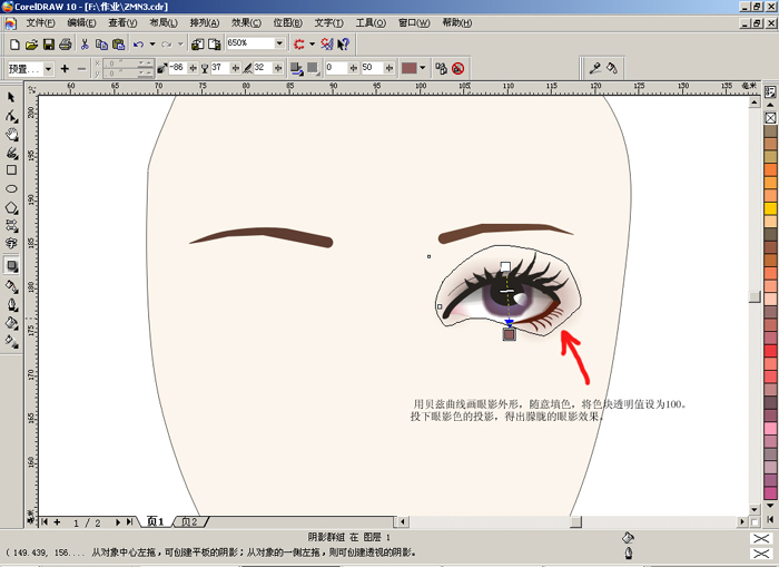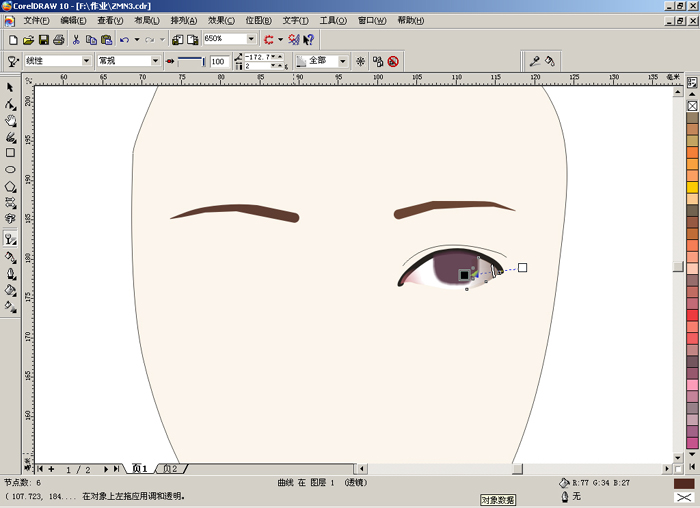 畫眼珠,為了使眼珠邊界柔和,我用貝茲畫了眼珠的輪廓,隨意填了一塊色,投下影子,然后使這塊形狀的本色透明度設為100,使的出柔和的眼珠邊界效果,你看到的眼珠其實是投下的陰影區,(以下稱此法為陰影法)