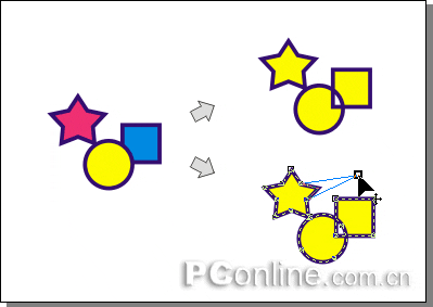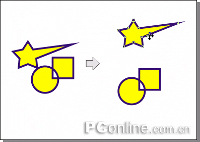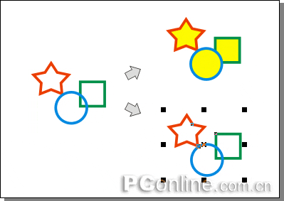 使用“組合”功能可以把不同的對象合并在一起,完全變為一個新的對象。如果對象在組合前有顏色填充,那么組合后的對象將顯示最后選定的對象(目標對象)的顏色。它的使用方法與群組功能類似。