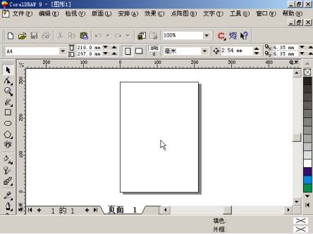 為了繪制新圖形,您需要在“歡迎來到coreldraw 9”對話框中單擊“新文件”按鈕,進入如圖2所示的主操作窗口,中文coreldraw 9也將同時建立一個繪圖頁面,并且命名為“圖形1 。在圖2中,光標所在的矩形區域是繪圖頁面中的可打印區域,中文coreldraw 9允許在操作窗口中創建多個頁面,單擊工具欄的“新建”按鈕便能建立起一個新的頁面,并自動以“圖形……命名。當然了,如果需要的話您可以輕而易舉的修改這些名稱。