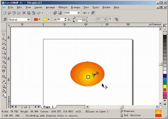3.這時候的填充,可能你還不太滿意,可以選擇fill tool下面的interactive fill tool來調整。這是coreldraw獨一無二的交互式填充工具,你可以即時看到效果,十分方便。調整在橢圓上顯示的色塊和箭頭,使它如圖所示。(3)