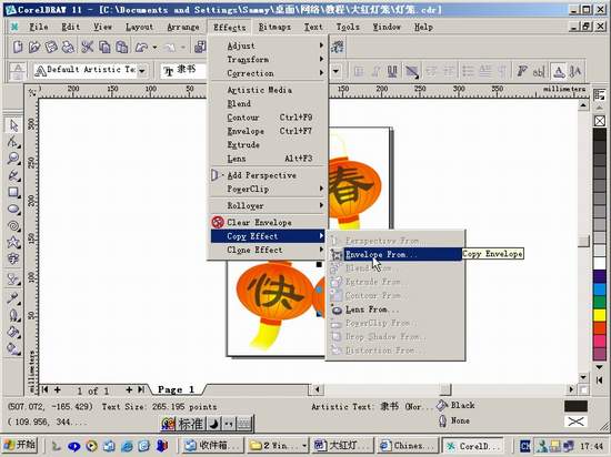 10.選擇text tool,打出“新”字,將其放到合適的大小,用interactive envelope tool—preset list—envelope 1給它加上圓形封套,再用interactive transparency tool,讓字看起來象寫在燈籠上的。(12)其他幾個字的封套和透明效果可以用effects—copy effect直接從“新”字的屬性復制過來。(13)