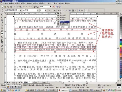 如果有請你注意了,這個小箭頭如果不先在word中處理好而直接拷文字到coreldraw中會有苦頭吃的。方法:在word中將光標移到灰色小箭頭前,按回車(enter)鍵再按delete鍵一個一個將其刪除。如果不這樣做你會發現將文字直接拷到coreldraw中并選完全對齊時就會出現如圖中的情況了,是不是頭大了?(如圖2 )