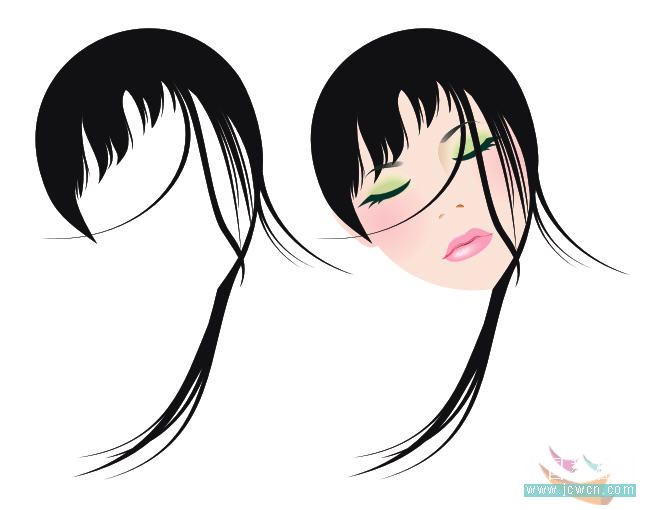先使用曲線類工具繪制頭發前面的部分,填充為黑色并去除輪廓。如下圖所示: