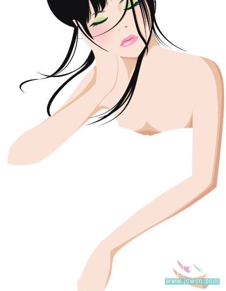 用曲線類工具繪制如下圖所示的封閉圖形,按下sfhit+pagedown組合鍵,將它置于最底層。再按住右鍵從人物臉部拖曳鼠標至此圖形上并松開鼠標,在彈出的菜單命令中選擇“復制所有屬性”命令,將臉部的顏色及輪廓屬性復制給它。