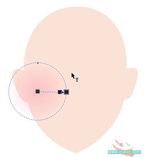 首先,使用曲線類工具繪制mm的鼻梁,填充顏色(c10、m20、y30、k0)并去除輪廓。然后再點擊工具箱中的“交互式透明工具”,從左向右拖曳鼠標,產生如下圖所示的透明效果
