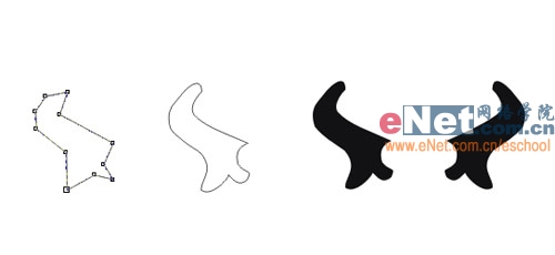 6、制作盤子的支腳。用貝塞爾工具畫出大致形狀,用形狀工具選中全部節點后按ctrl+q轉換為曲線,然后調節為如下形狀,填充黑色。復制一份,水平翻轉后挪到右邊,將兩個支腳放到盤子下部的合適位置,一個晶瑩剔透的盤子就完工了。
