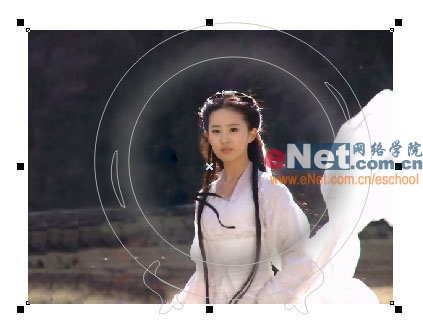 7、按ctrl+i導入一張小龍女的圖片,這個畫面美麗清冷,很符合瓷器給人的清新雅致的感覺。保持圖片選中狀態,選擇效果->圖框精確剪裁->放置在容器中,出現黑色的箭頭后點一下盤子里的小圓,圖片就進去了。