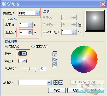 4、選擇工具箱中的“填充工具”(或者按f11快捷鍵),在彈出的工具組中選擇“漸變填充”,隨后彈出“漸變填充方式”對話框,在“類型”下拉列表框中選擇“射線”,單擊“顏色調和”選項區“從”后的色塊,在彈出的下拉列表中單擊“其它”按鈕。參數如圖4a所示: