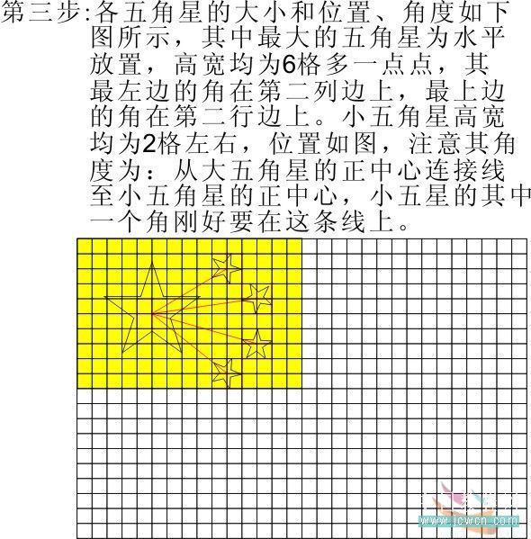 三、各五角星的大小、位置、角度如下圖所示,其中最大的五角星為水平放置,高寬均為6格多一點點,其最左邊的角在第二列邊上,最上邊的角在第二行邊上。小五角星高寬均為2格左右,位置如圖,注意其角度為:從大五角星的正中心連接線至小五角星的正中心,小五星的其中一個角剛好要在這條線上。