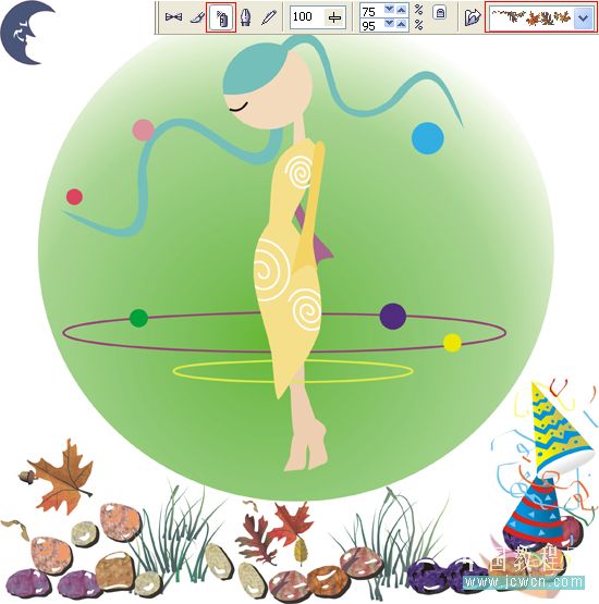 單擊“藝術筆工具”/“噴罐”,在“噴涂列表文件列表”中選擇石頭、小草、楓葉、小卡通帽等藝術筆(我用的是coreldraw12版本)來繪制背景素材后,完成效果如圖16c所示: