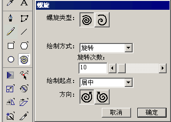 在freehand 中使用螺旋工具繪制出來的對象最貼近蜘蛛網(wǎng)那一條絲了,所以它是首選工具。首先我們先雙擊工具面板中的 螺旋工具 ,此時(shí)會彈出螺旋工具屬性對話窗口,按如下圖所示設(shè)置,設(shè)置繪制方式為旋轉(zhuǎn),旋轉(zhuǎn)次數(shù)為10,點(diǎn)擊確定按鈕。