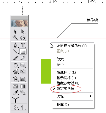【ctrl +r】打開標尺,從水平標尺區拖拽出一條參考線。在畫板上點擊右鍵,如果看到鎖定參考線選項被選中,把它關閉。我們就激活了參考線。
