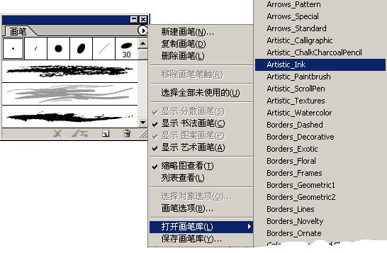 5、在畫筆調(diào)板的彈出菜單中選擇:打開畫筆庫,選擇artistic_lnk這個筆庫。