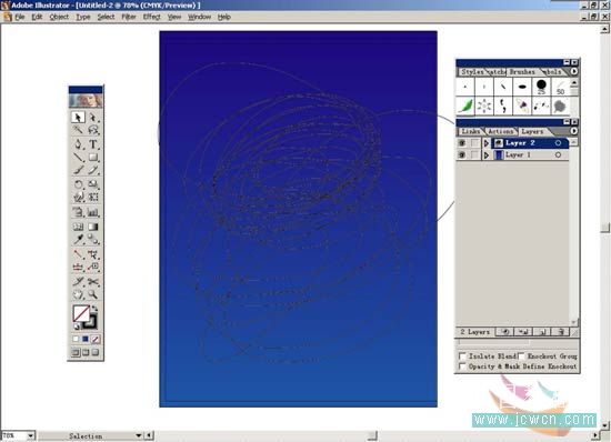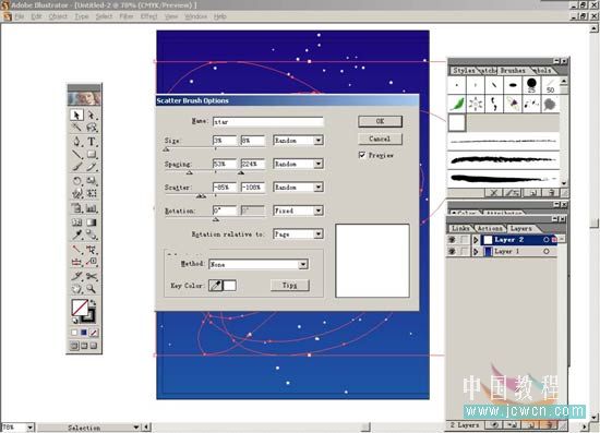 4.現(xiàn)在開始繪制滿天的星星。先打開window>layer或按f7打開layer面板,按面板上的新建按鈕,建立一個新層。選擇pencil tool工具,將前景色關(guān)閉,在畫面上隨意的畫圈。