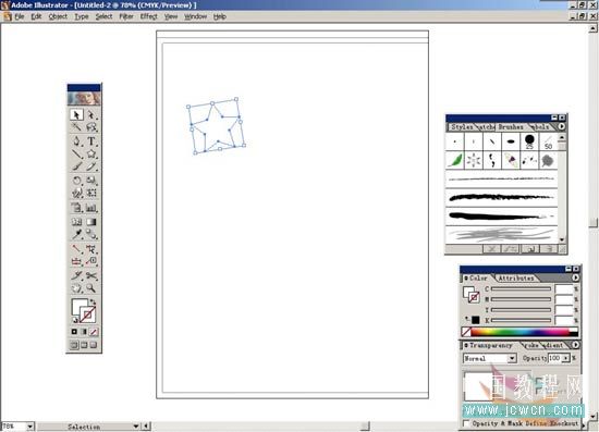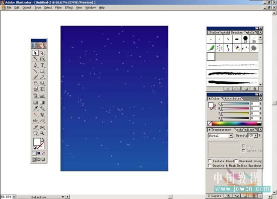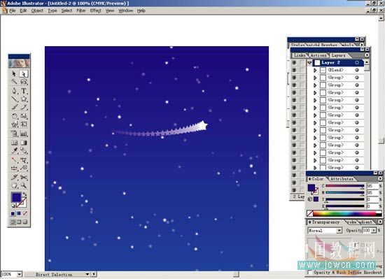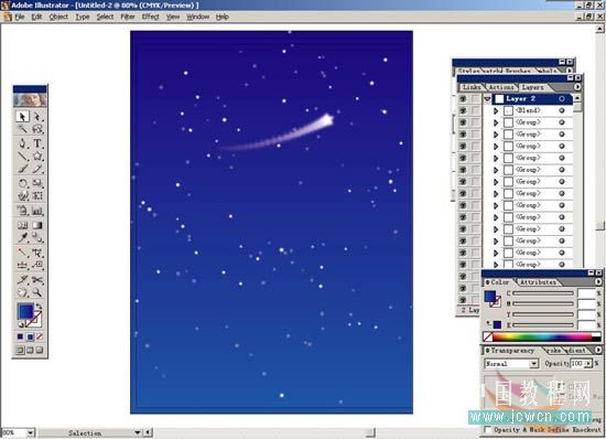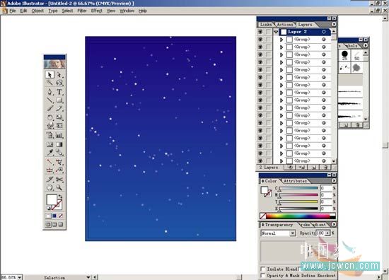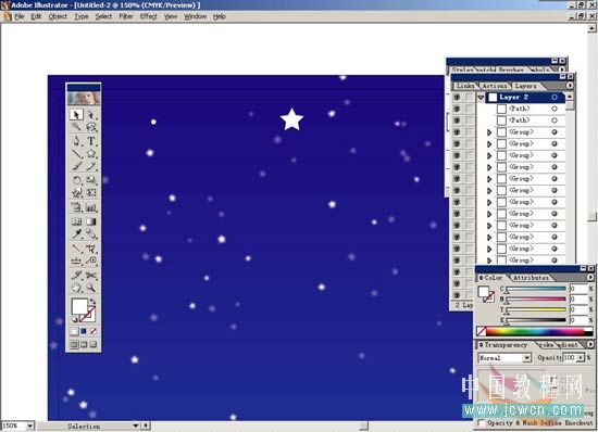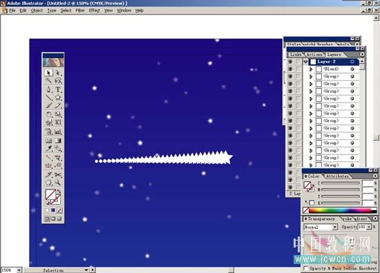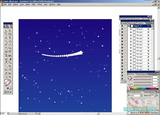 9.打開layer2的小三角會顯示出所有星星的單獨路徑,按住alt+shfit鍵,在layer2中有間隔的任意點擊選出一部分星星,再打開transparency面版,將opacity設(shè)定為100%。