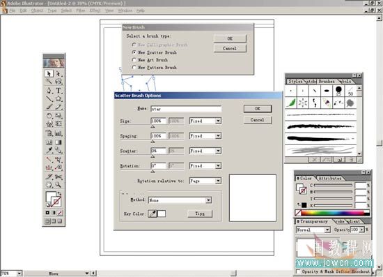2.打開window>brushes或按f5打開brushes面板。用selection tool工具選中五角星并將其拖到brushes面板上,跳出定義筆刷的對話框,按ok按鈕會再跳出一個筆刷設(shè)置的對話框,在name里面輸入star,按ok按鈕確定。