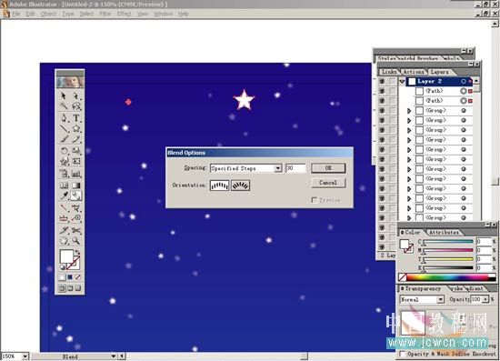 8.在layer面板上按住alt鍵去點layer2,將全部的星星選中,在選effect>blue>gaussian blur,radius為1,按ok按鈕確定。再打開window>transparency或按shift+f10,打開 transparency面版,模式選為screen,opacity為40%。