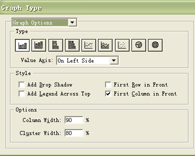 在創建圖表之前我們一般要設置圖表的類型,當然也可在創建后根據需要更改。展開illustrator 10工具箱中的圖表工具按鈕,我們可以看到illustrator 一共可以創建以下9種圖表: 1.柱形圖