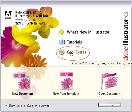 illustrator cs十分人性化的提供了縮略圖文件。在開始畫面中點選cool extras,或是在illustrator cs所在的文件夾根目錄下察看additional content.pdf文件即可(如下圖)。