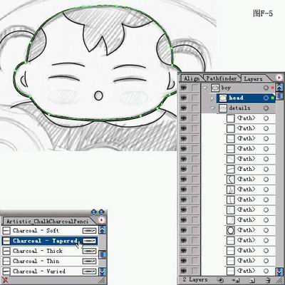 5.選中head路徑,選擇window/brush libraries/artistic_chalk charcoal pencil(窗口/筆刷庫/藝術家—粉筆炭筆鉛筆),選擇charcoal-tapered筆刷,給路徑運用筆刷效果。(圖f-5所示)