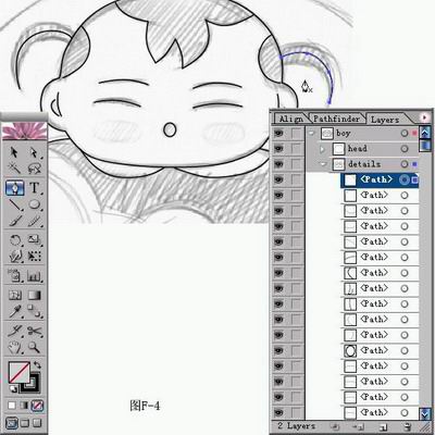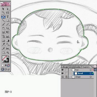3.新建一個圖層boy,添加一個子圖層head。按p鍵切換到鋼筆工具,把填充色設為無色, 輪廓色為黑色,在head子圖層上用鋼筆工具根據(jù)底下的模板圖層描摹頭部的封閉路徑。(圖f-3所示)