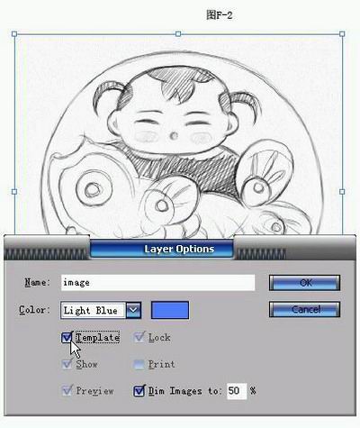 2.執(zhí)行file/place(文件/置入),置入一張事先畫好的輪廓掃描草圖。雙擊置入草圖的圖層,命名圖層,勾選template(模板)選項,把當前圖層變成半透明的模板圖層。(圖f-2所示)