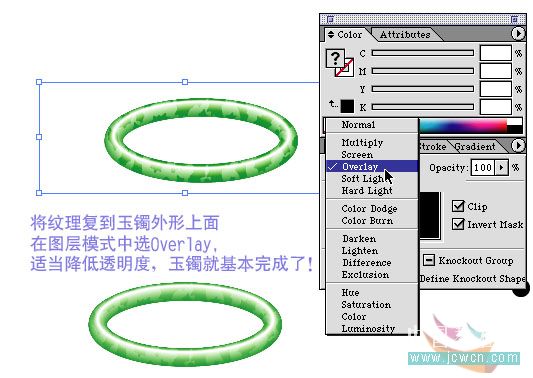 將紋理復制到玉鐲外形上面,在圖層模式中選over1ay(疊加),適當降低透明度,玉鐲就基本完成了