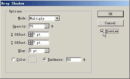 單擊對話框中的preview(預覽)選項,可預覽到添加的陰影效果,如果不滿意,可以調節各種選項,直至滿意后單擊ok按鈕即可,如(圖38)所示。