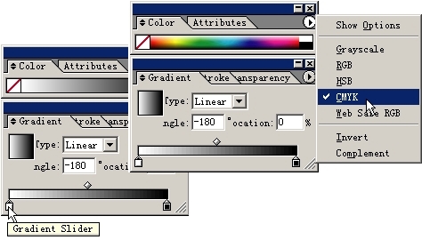 單擊gradient(漸變色)標簽,調出漸變色選項面板,并單擊選項面板中的漸變起始色調節滑塊。