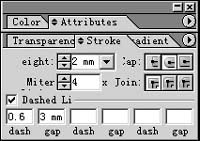 6. 在圖層“走向”之下建立一個(gè)新圖層,命名為“圖案”。使用“pen”(鋼筆)工具,先繪畫出一片完整的大葉子正視圖,打開“stroke”(勾邊)面板,設(shè)置線粗為2,端點(diǎn)為圓形,勾選“dashed li”(虛線),設(shè)置虛線長度為0.6,間距為3,如圖2所示。全選這片葉子,按下“ctrl+g”組合鍵將其組合。