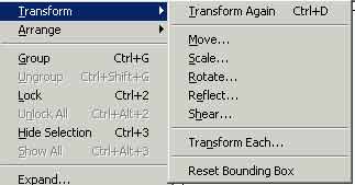 包含transform again(再次變形)、move...(移動)、scale...(縮放)、rotate...(旋轉)、shear...(傾斜)、reflect...(鏡像)、transform each...(單獨變形)、reset bounding box(重設調節框)命令。移動、縮放、旋轉、傾斜、鏡像命令的效果和工具箱中的工具的效果一樣,不過用這些命令可以精確的輸入數值。如移動對話框中就可以精確的輸入橫向移動距離,縱向移動距離、距離、角度等等。