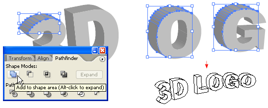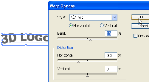 選用illustrator字體工具輸入“3d logo”。然后在效果菜單 選擇 彎曲 選擇 弧度(effect >warp > arc)做如下設(shè)置: