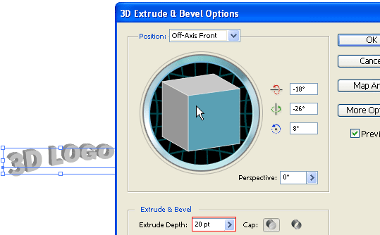 然后在效果菜單 選擇 三維,再選擇 擠壓與導角( effect > 3d > extrude & bevel )做如圖設(shè)置。你可以用拖拽立方體的方法來設(shè)置x,y,z坐標的值。設(shè)置擠壓深度為20pt。