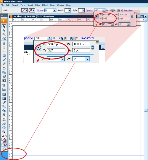 接下來,我們得精確的放置輔助線。確定你的輔助線沒有被鎖定,拖拽一條垂直輔助線靠近你下降部的大概高度。然后選擇這條輔助線,點擊“變形”按鈕,為它設(shè)置精確的數(shù)值。