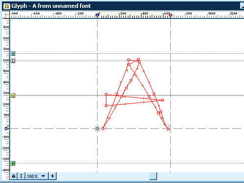尺寸明顯不對,但是很容易修正,這要歸功于我們剛才繪制的那些輔助線。選擇字形,按住 shift 鍵(以確保按比例縮放),然后將字形縮放到輔助線的高度。
