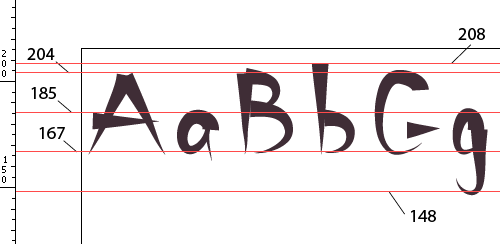 注意你每條輔助線的位置,把它們的數(shù)值記下來,我們將把它們匯總起來做一點小小的計算。有一個基本概念:fontlab 采用 upm (units per em/元素單位)這個術(shù)語來測量字體,然后我們必須想辦法把你在 illustrator 中使用的任意一種單位轉(zhuǎn)換成 upm。首先我們要在 illustrator 中測量“元素方塊”(你的字體中從下降部到上升部之間的距離)。本例中的元素方塊為 60 毫米,因為上升部是 208,下降部為 148,兩者之間的距離是60。緊接著,我們繼續(xù)測量其余的垂直度量在 illustrator 中的單位數(shù)值。