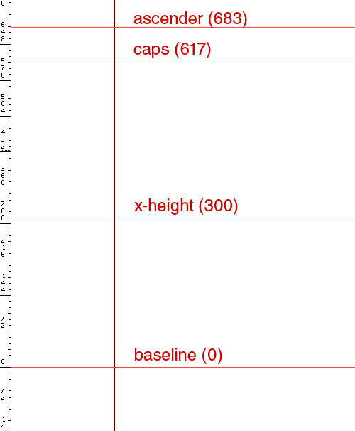 現(xiàn)在我們該新建一個 fontlab 文件了。新建,然后在文件菜單中選擇“字體信息”,展開“度量與尺寸”節(jié)點,點擊“關(guān)鍵尺寸”選項,設(shè)置上升部、下降部、大寫高度、x-高度的數(shù)值,本例中為 683, -317, 617, and 300。