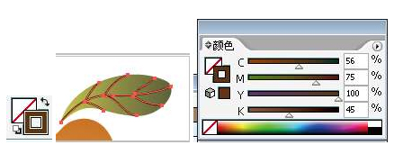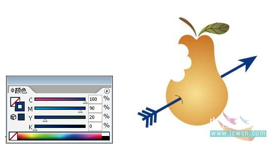 5,實用同樣的方法給箭頭上色。果柄顏色和脈胳的顏色相同,可以選中柄的路徑,用吸管工具吸引脈胳的顏色,將前景色和背景色調換(點單擊填充和描邊上右上方的雙向箭頭,或shift+x)