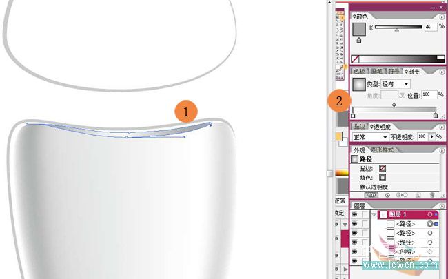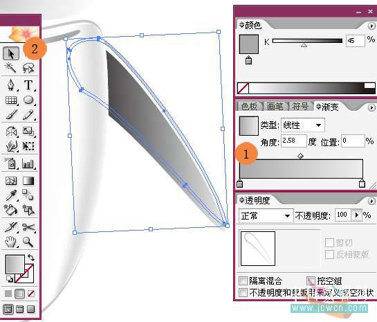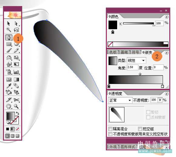13、選用橢圓工具,繪制黑色橢圓,描邊無。使用直接選擇工具進行調整。再填充100-65%的漸變。如圖: