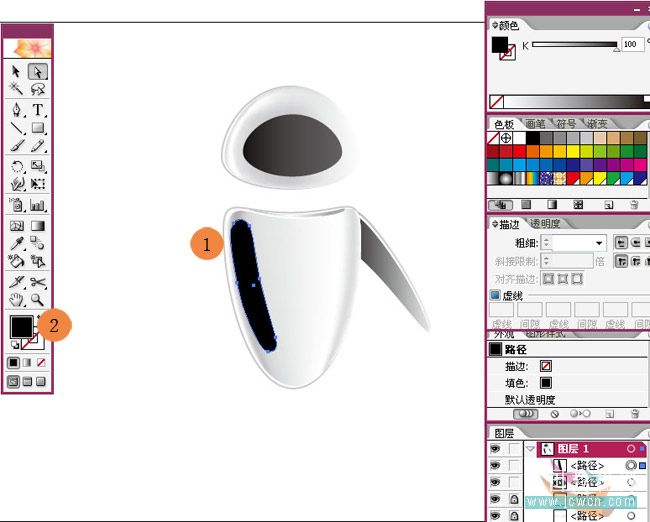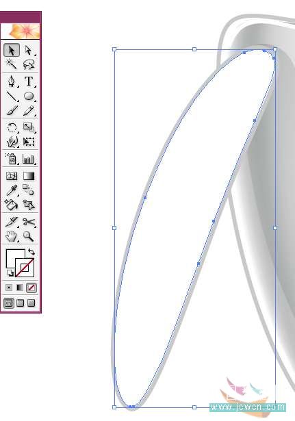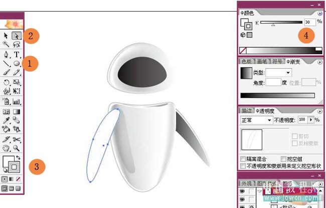 9、使用橢圓工具來出左手,用直接選擇工具進行調整,設置填充為白色,描邊為30%的灰度。如下圖: